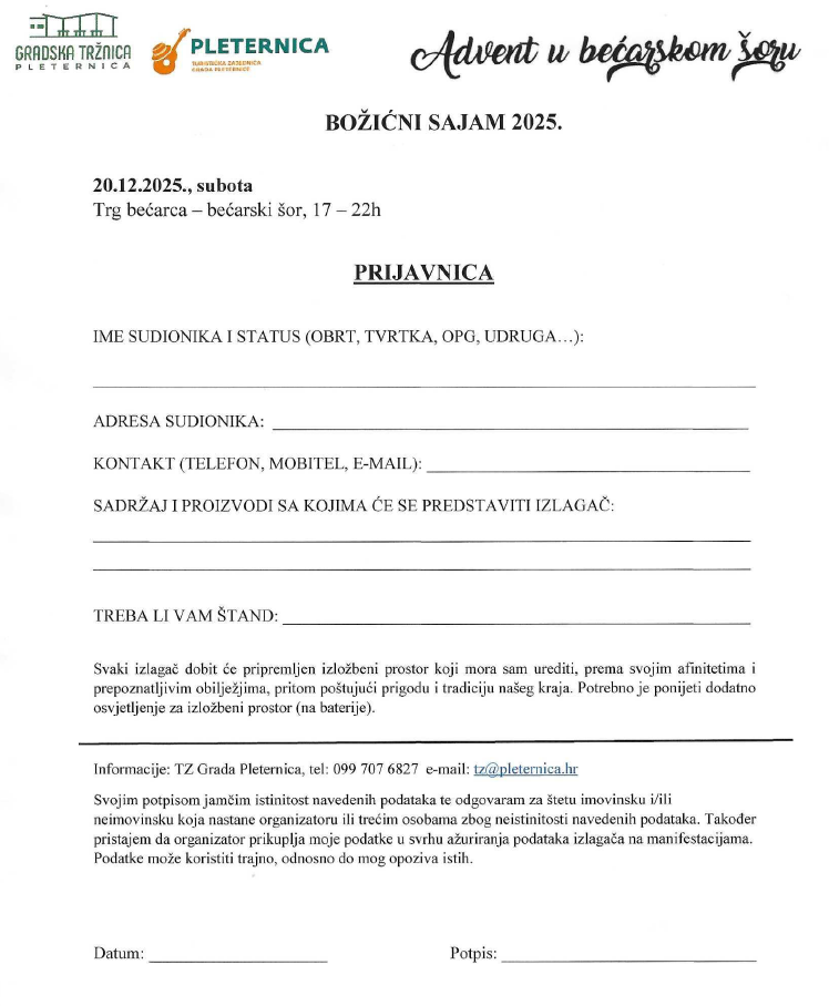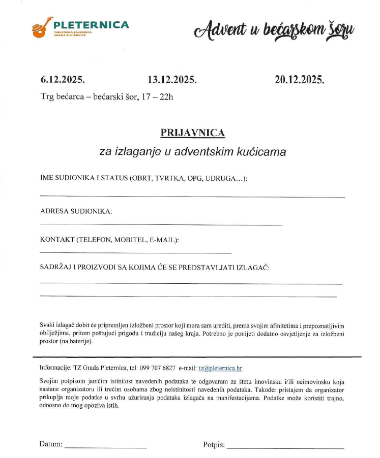 Uskoro više detalja o Adventu u bećarskom šoru. Do tada, u prilogu se nalaze prijavnice za Božični sajam i Adventske kućice.
