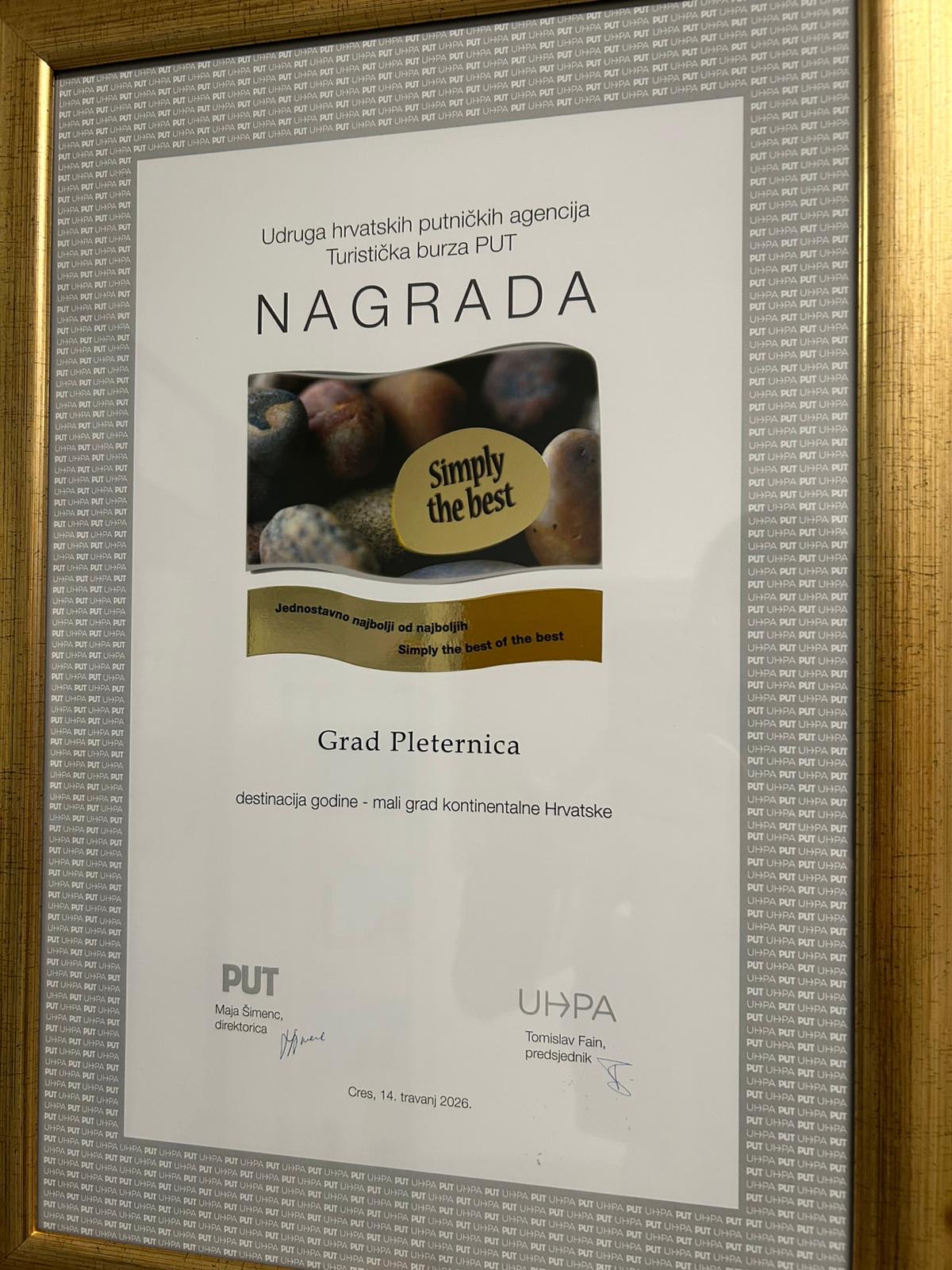 Grad Pleternica dobitnik je nagrade „Simply the Best“ za najbolju turističku destinaciju u kategoriji mali grad kontinenta, čime je još jednom potvrđen kvalitetan i predan rad na razvoju turizma.