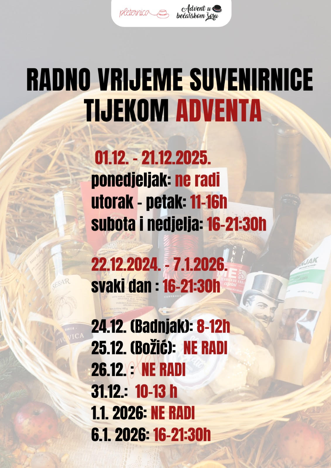 Tijekom razdoblja Adventa uvodimo posebno radno vrijeme kako bismo vam omogućili još više uživanja u blagdanskom programu.